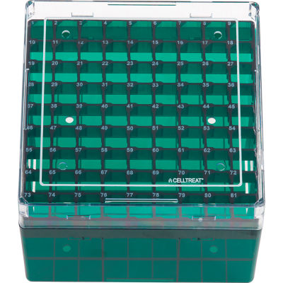 - Easy-grip workstation rack has individual positions which feature ribs to interlock with self-standing vials for easy one hand opening, features four gripping feet for increased stability and reduced slipping, and has low-profile design for maximum storage efficiency celltreat freeze cryogenic vial storage boxes are made from durable polycarbonate material designed to withstand a wide temperature range and is a reusable, autoclavable alternative to disposable racks ventilation holes in the lids and bases prevent vacuum sealing in freezer storage boxes are labeled with numeric markings on the base of the box for easy identification of individual positions, with or without the lid 100-place rack features ridges along the sides to improve handling