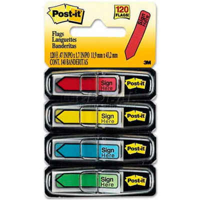 :sign here" arrow flags - 1/2" - 4 pack - assortment these yellow, blue, green and red 1"w x 1-3/4" post-it® flags are packaged in a pop up dispenser for ease of use and desktop convenience. The bold arrow points precisely where you need it on the document. Stick securely and remove cleanly.