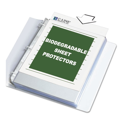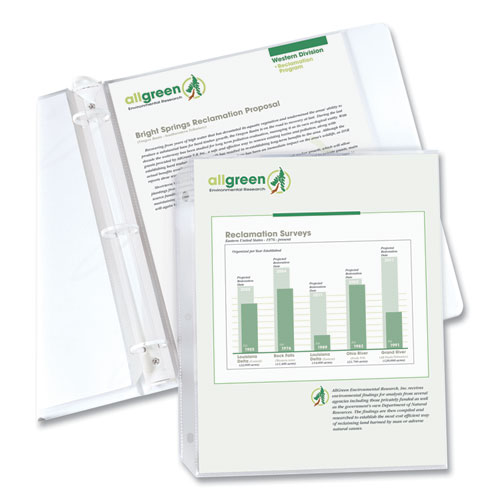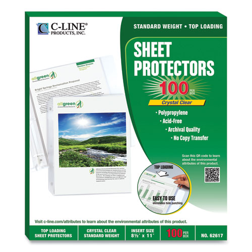 Polypropylene sheet protectors are constructed out of standard weight material. Top loading design adequately stores documents without taking up additional binder space. The acid-free material eliminates photocopy transfer.