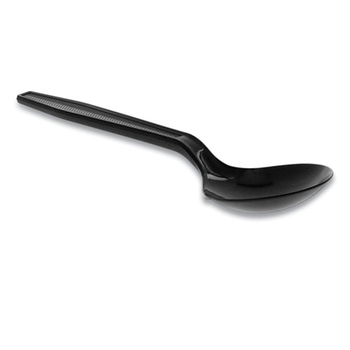 - Utensils type: soup spoon; material(s): polystyrene; color(s): black; grade: medium heavy weight.