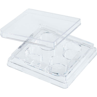 - 4 well plate is a smaller footprint option which offers well size similar to that of a 24 well plate, but has expanded well spacing to reduce cross contamination