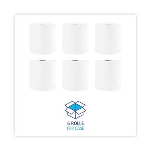 Boardwalk® white paper towel rolls are one-ply paper towels that are hardwound in rolls without perforations. Durable and absorbent material for hand drying in commercial washrooms with heavy traffic. Bleached white and slightly textured.