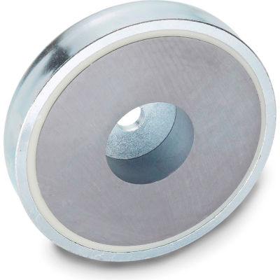 J.W. Winco 50.4-hf-100 retaining magnet assembly disc-shaped w/ thru hole - 3.94" diameter, steel gn 50.4 magnets are a shielded magnetic assembly. To ensure that the magnetic forces are not impaired, the mounting screws must be made of non-magnetic material.