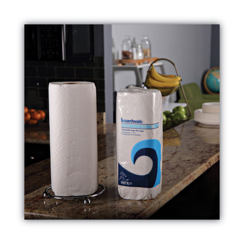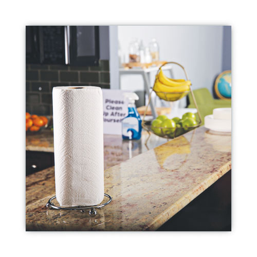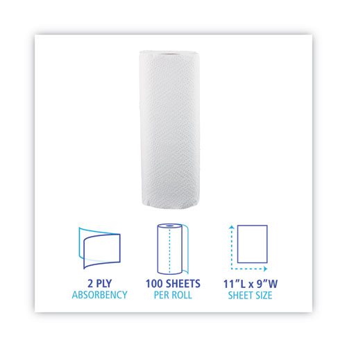 Absorbent kitchen roll towel for general cleaning in kitchens, bathrooms, offices, and industrial settings. White, embossed paper towel wipes to remove dirt, dust, grease grime, liquid, and soil. Use to soak up spills and wipe surfaces clean.