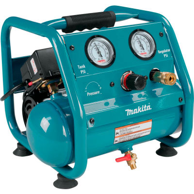 Makita® ac001, 0.17 hp, hand carry, 1 gallon, hot dog, 125 psi, 0.45 cfm, 1-phase 120v the ac001 is powered by a 1/6 maximum horsepower induction motor that provides up to 125 psi, with a lightweight design (only 23.1 lbs.). It also has lower noise (72dba) so it's ideal for indoor use. The roll cage construction provides added protection for the pump and motor assembly.