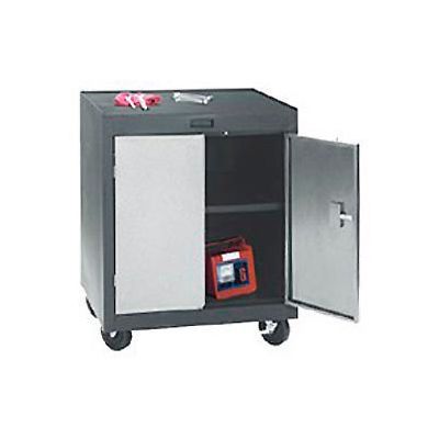 Mobile two door cabinet mobile cabinet stores conveniently under workbench. 1 fixed shelf provides storage for your tools and other work items. Keyed single point locking system for secure storage.