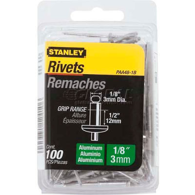 Stanley® paa48-1b, aluminum rivets 1/8" x 1/2", 100 pack medium-strength aluminum can be used with aluminum and where rust is a potential problem. Reusable, full-visibility packaging simplifies product selection and storage.